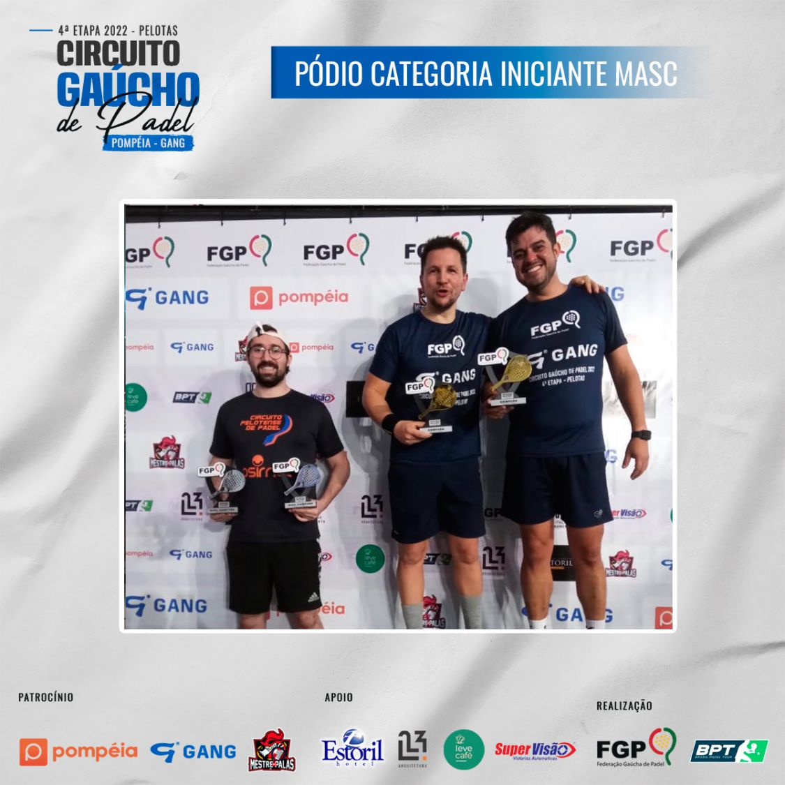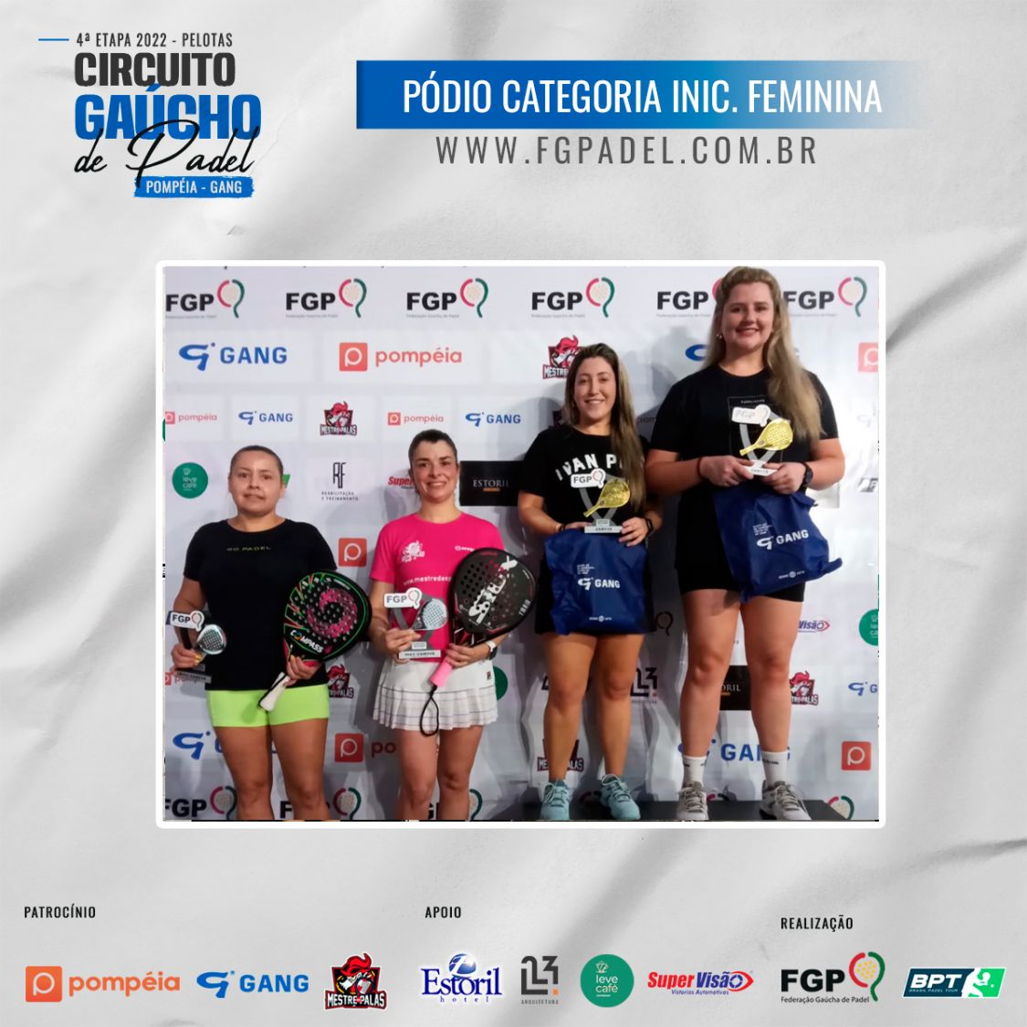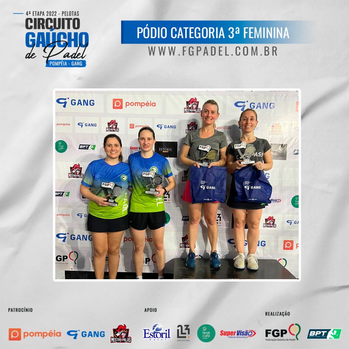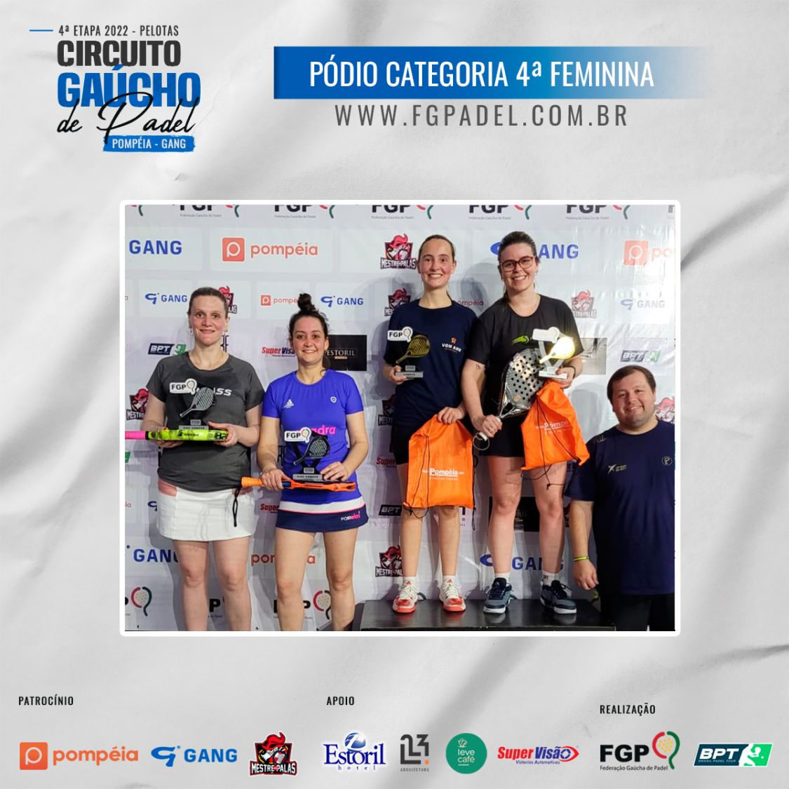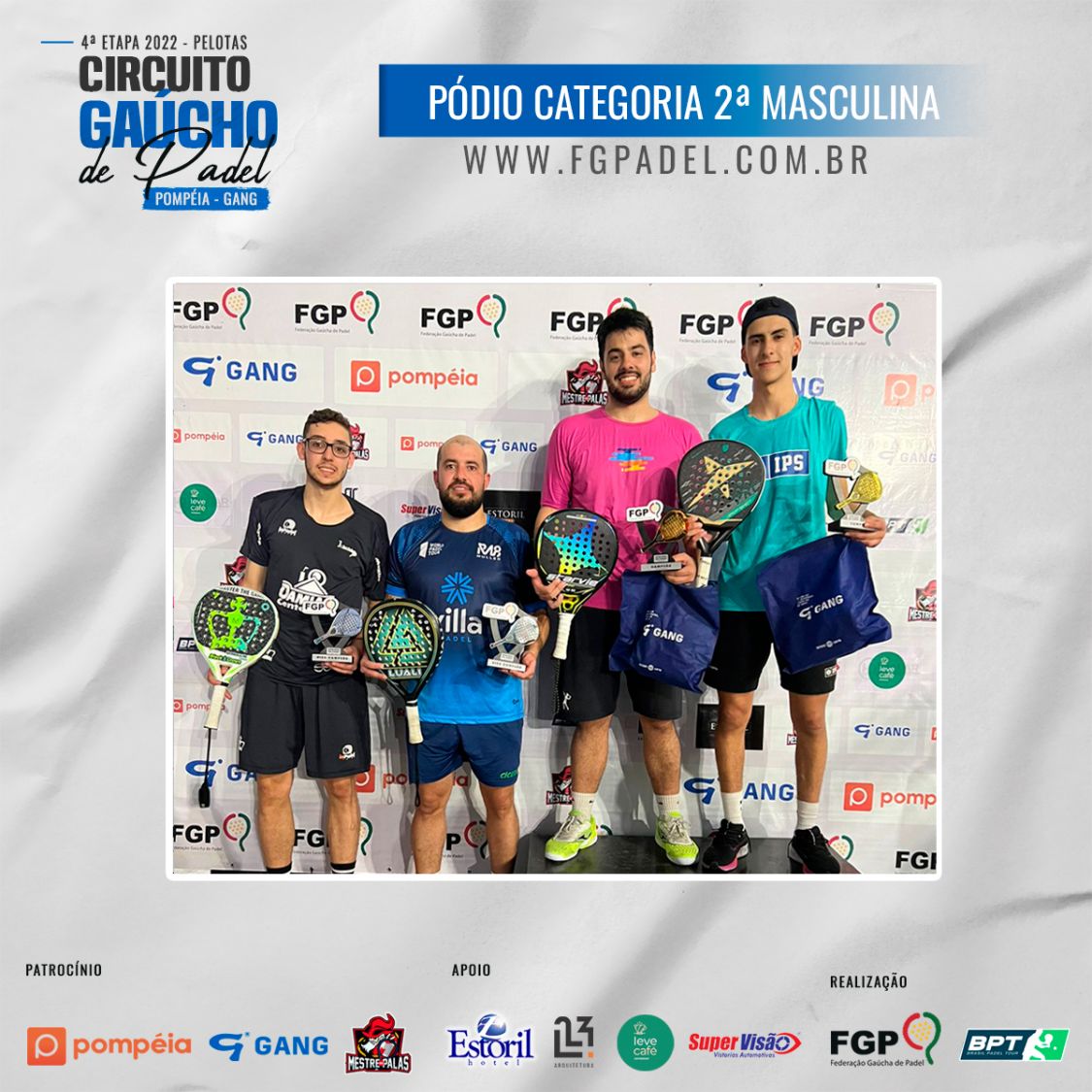 Confira os campeões e vices da 4ª etapa do Circuito Gaúcho de Padel 28/10/2022 LEIA TAMBÉM Regras para inscrições do Time Gaúcho no *Interfederações 2025*. Comunicados aos atletas da 1ª categoria Masculina e Feminina Inscrições abertas para a 3ª etapa do Circuito Gaúcho de Padel Pompéia/Gang - 2023, que acontecerá em Santa Maria nos dias 18, 19 e 20 de Agosto de 2023.