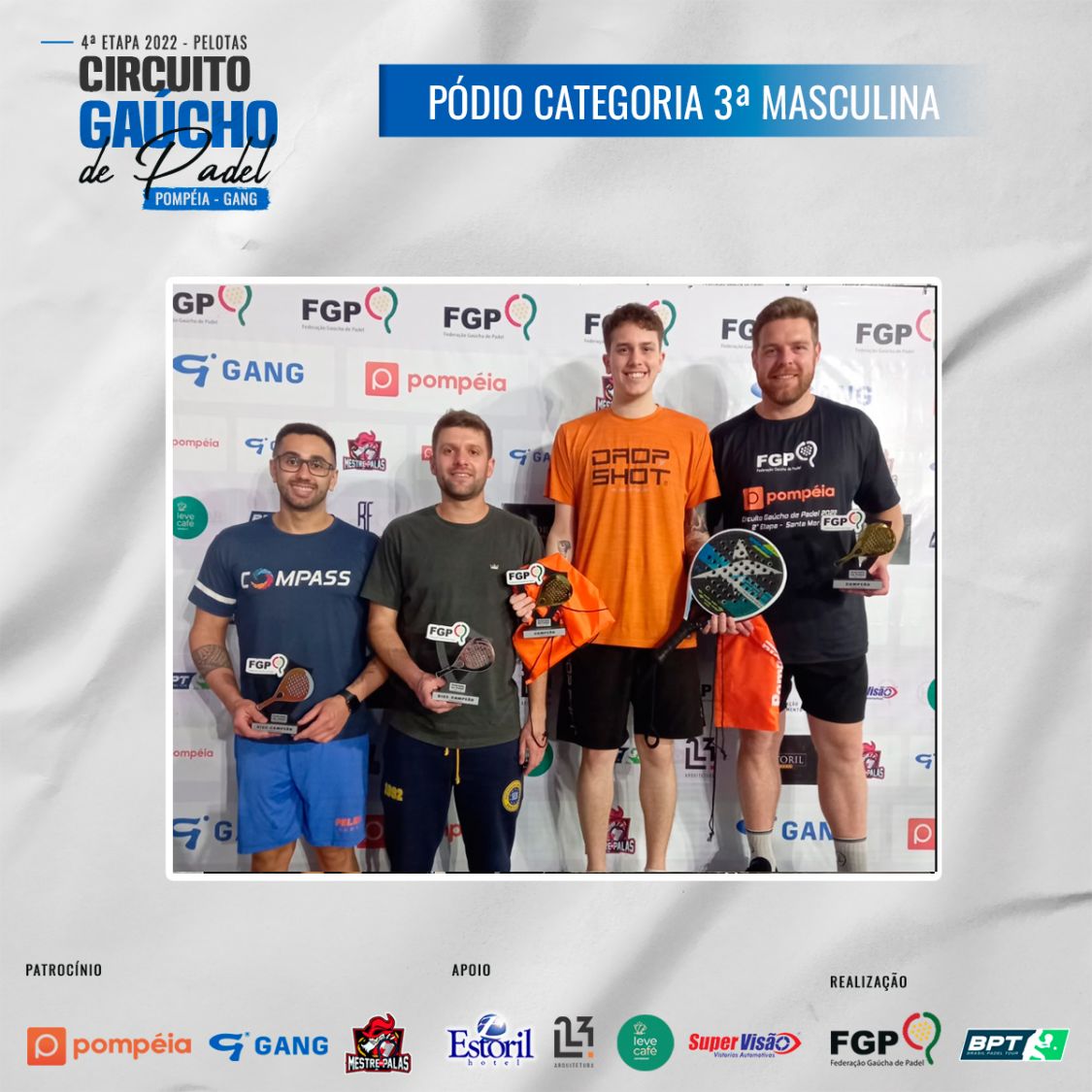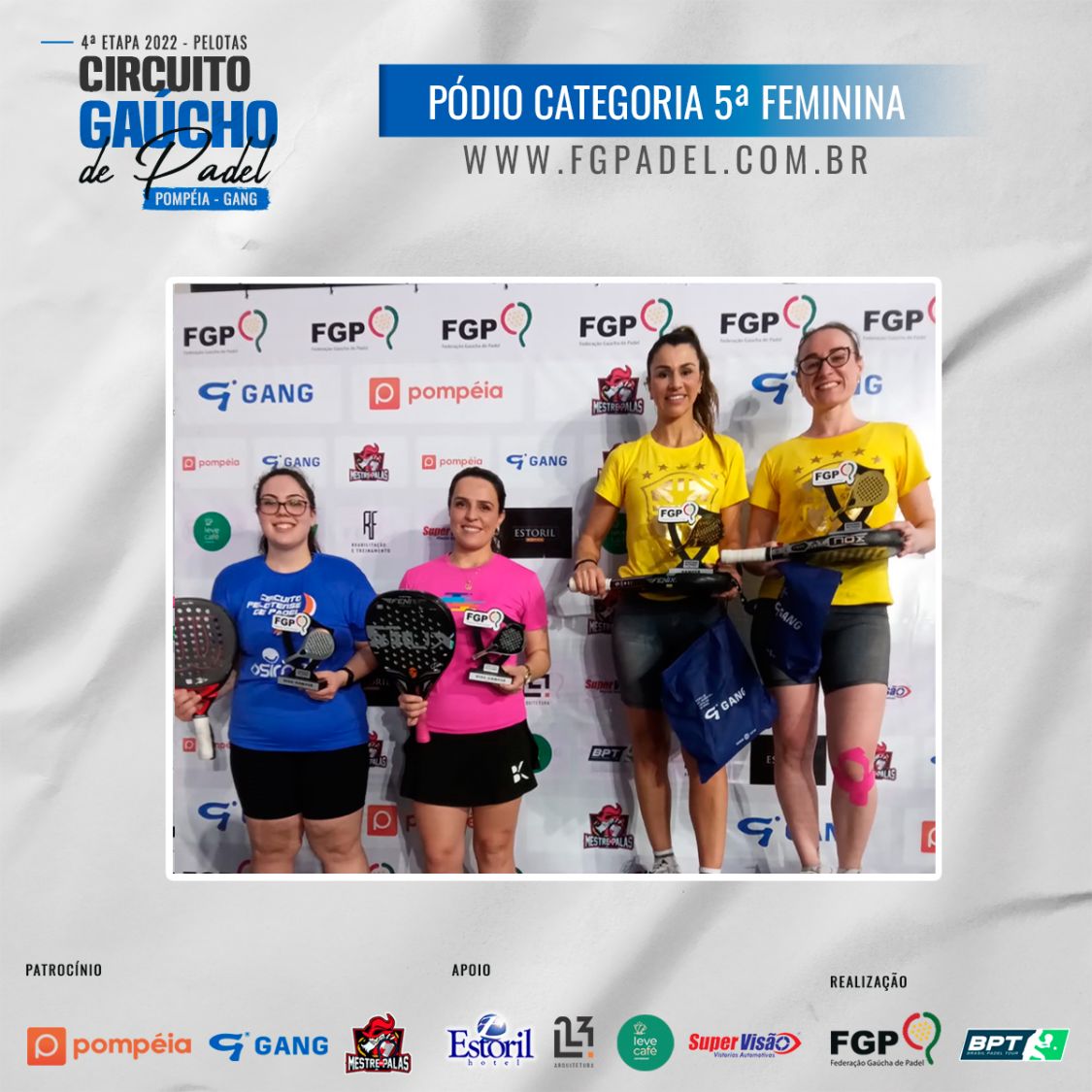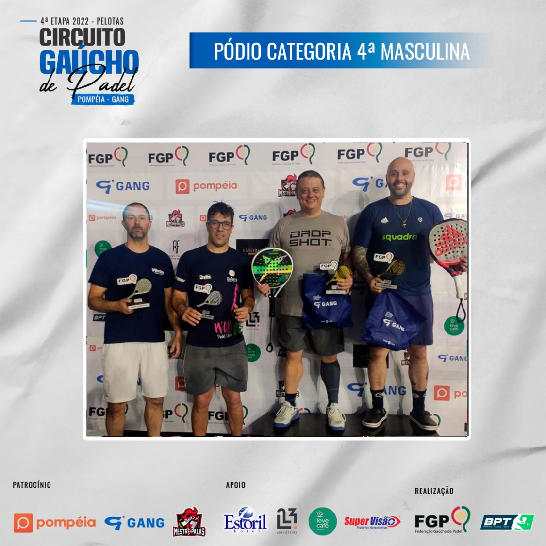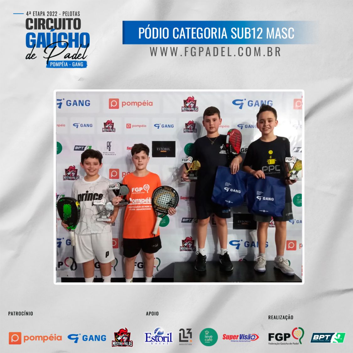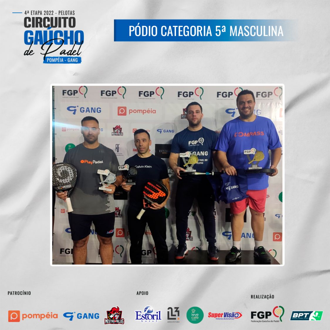 Confira os campeões e vices da 4ª etapa do Circuito Gaúcho de Padel 28/10/2022 LEIA TAMBÉM Regras para inscrições do Time Gaúcho no *Interfederações 2025*. Comunicados aos atletas da 1ª categoria Masculina e Feminina Inscrições abertas para a 3ª etapa do Circuito Gaúcho de Padel Pompéia/Gang - 2023, que acontecerá em Santa Maria nos dias 18, 19 e 20 de Agosto de 2023.